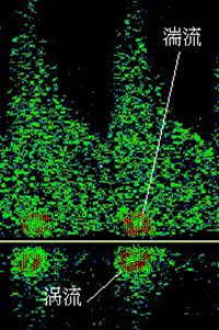 5)渦流:在病理情況下出現(xiàn)。 渦流也是湍流,是雙向湍流頻譜,頻譜圖像的反方向相對與收縮期的位置出現(xiàn)的一小團強信號。當血液由較大口徑血管流入較小口徑血管時,血流速度明顯加快,血液不僅向前流動,部分血液還呈一定角度作旋轉(zhuǎn)運動,血液與血管壁之間形成渦流。此時紅血球呈多方向性,一部分紅細胞朝向換能器,一部分紅細胞遠離換能器,故產(chǎn)生雙向的血流頻譜。特點:收縮期血流明顯增高,在收縮期內(nèi)頻譜的相反方向出現(xiàn)血流信號,即雙向湍流頻譜,這是由于血液在血管內(nèi)的旋轉(zhuǎn)運動產(chǎn)生反向高速運動所致。此頻譜出現(xiàn)在腦血管重度狹窄病例。