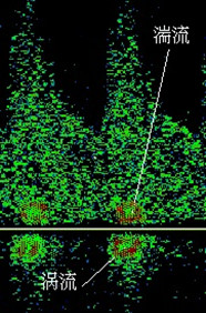 4)湍流:在病理情況下出現(xiàn)。頻窗內(nèi)出現(xiàn)的一小團(tuán)高頻信號(hào)稱為湍流(如血管狹窄時(shí)的射血,心臟關(guān)閉不全時(shí)的返流)。湍流所顯示是頻譜增寬、光點(diǎn)疏散、頻譜包絡(luò)線毛糙的圖形,“頻窗”消失,多普勒輸出可聽到嘈雜刺耳的血流聲。