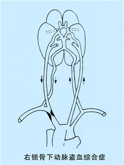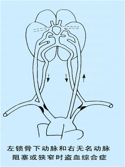 當鎖骨下動脈或無名動脈的起始部發(fā)生部分或完全阻塞時,由于上肢用力或運動時,會發(fā)生血流的轉移或再分配,即患側椎動脈的血流減少或產生反向流動,而進入患側鎖骨下動脈的遠離阻塞部,從而產生了椎-基底動脈供血不足和患側上肢的缺血,稱之為鎖骨下動脈盜血綜合征。